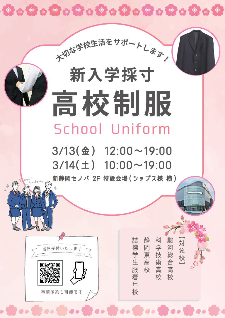 交通アクセス抜群の新静岡セノバにて「公立高校新入学制服採寸会」を開催します!
