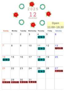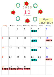 ※12月13日は諸事情により、誠に勝手ながら臨時休業とさせていただきます。