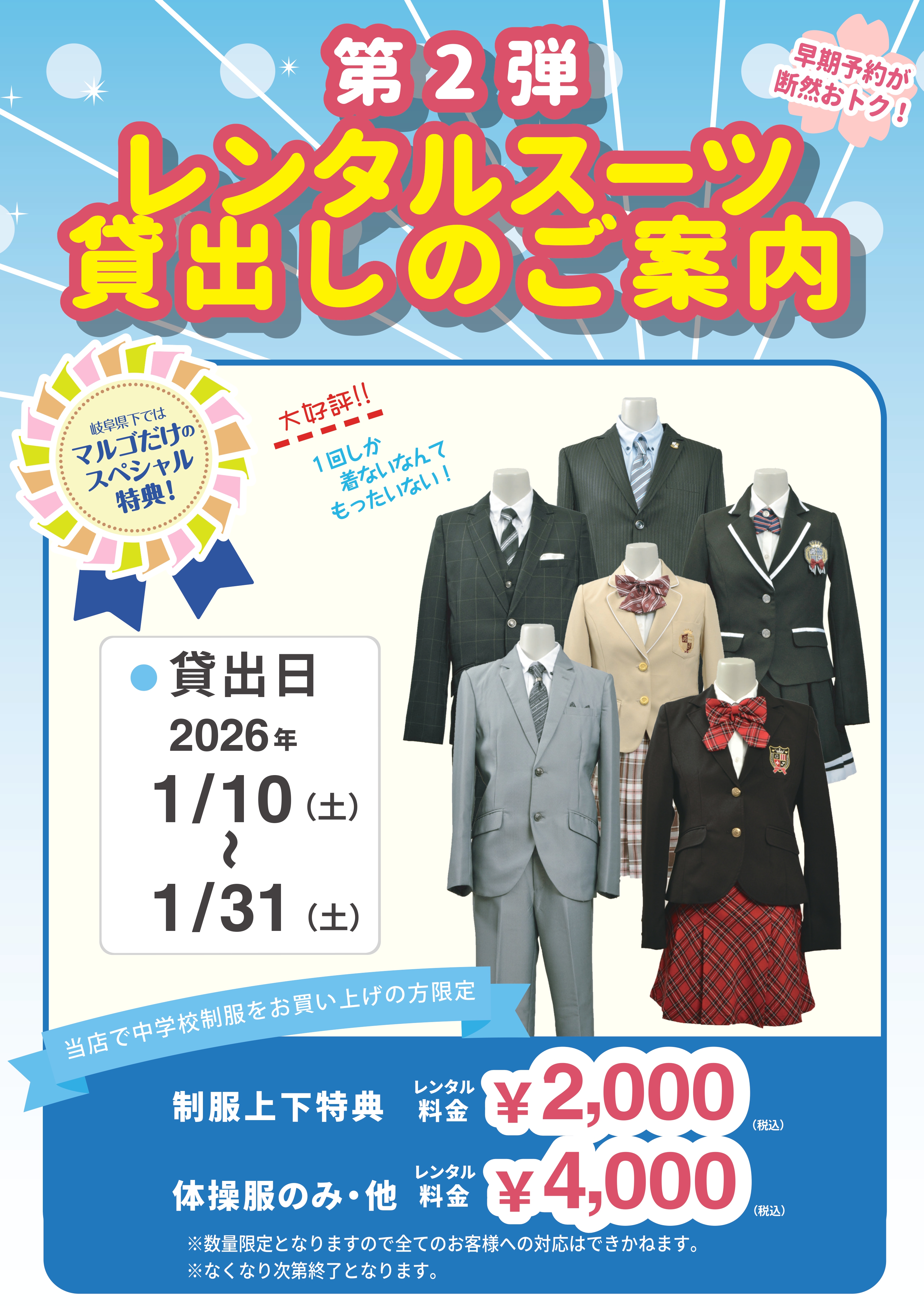 第2弾!!小学校卒業式のレンタルスーツ貸出を1/10(土)~31(土)行います。