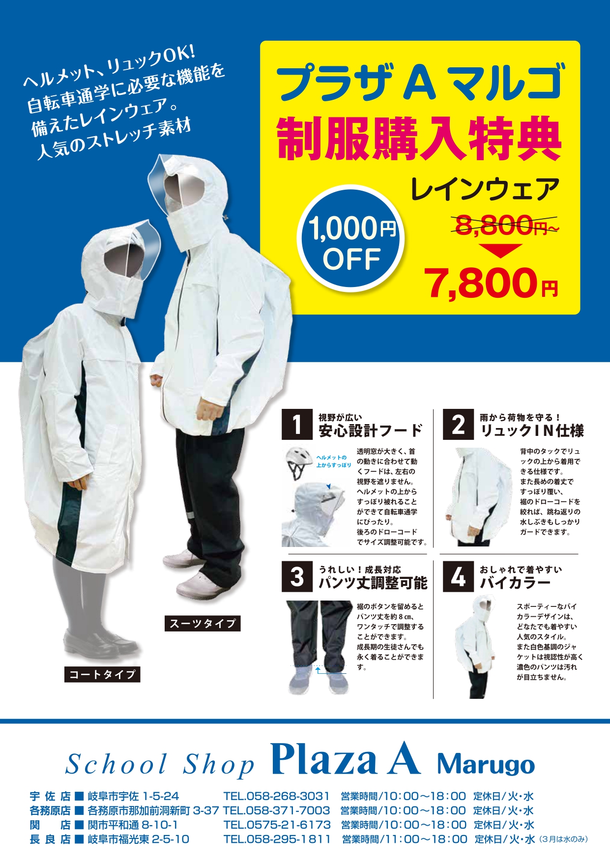 ・通学靴、学生ベルト、レインウェア、ヘルメット等もお取扱いしております。